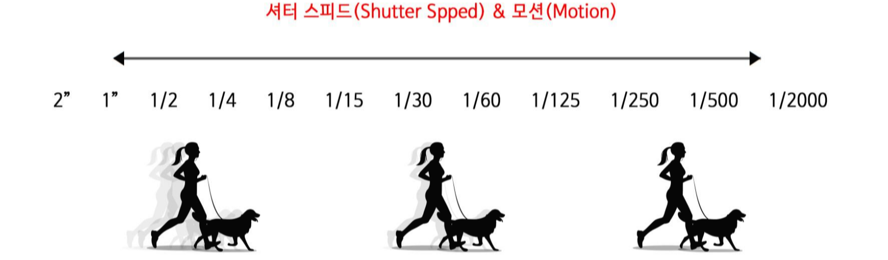 셔터 스피드는 1초에서 n분의 1초(때로는 최대 1/8000)까지 시간 단위로 측정됩니다. 셔터 스피드 분모가 클수록 셔터가 더 빨리 열리고 닫히며 카메라 센서에 더 적은 빛이 노출되게 합니다. 낮은 셔터 스피드를 사용하면 셔터가 더 오래 열리고 이미지 센서에 많은 빛이 들어오게 됩니다. 일반적으로 1/60보다 느린 셔터 스피드는 이미지상에 피사체의 움직임이 흐릿하게 되기 때문에 사용하지 않습니다. 만약 1/60보다 느린 셔터 속도를 사용하는 경우 삼각대와 같은 카메라를 안정시킬 수있는 것이 필요하다는 점을 명심하셔야 합니다.